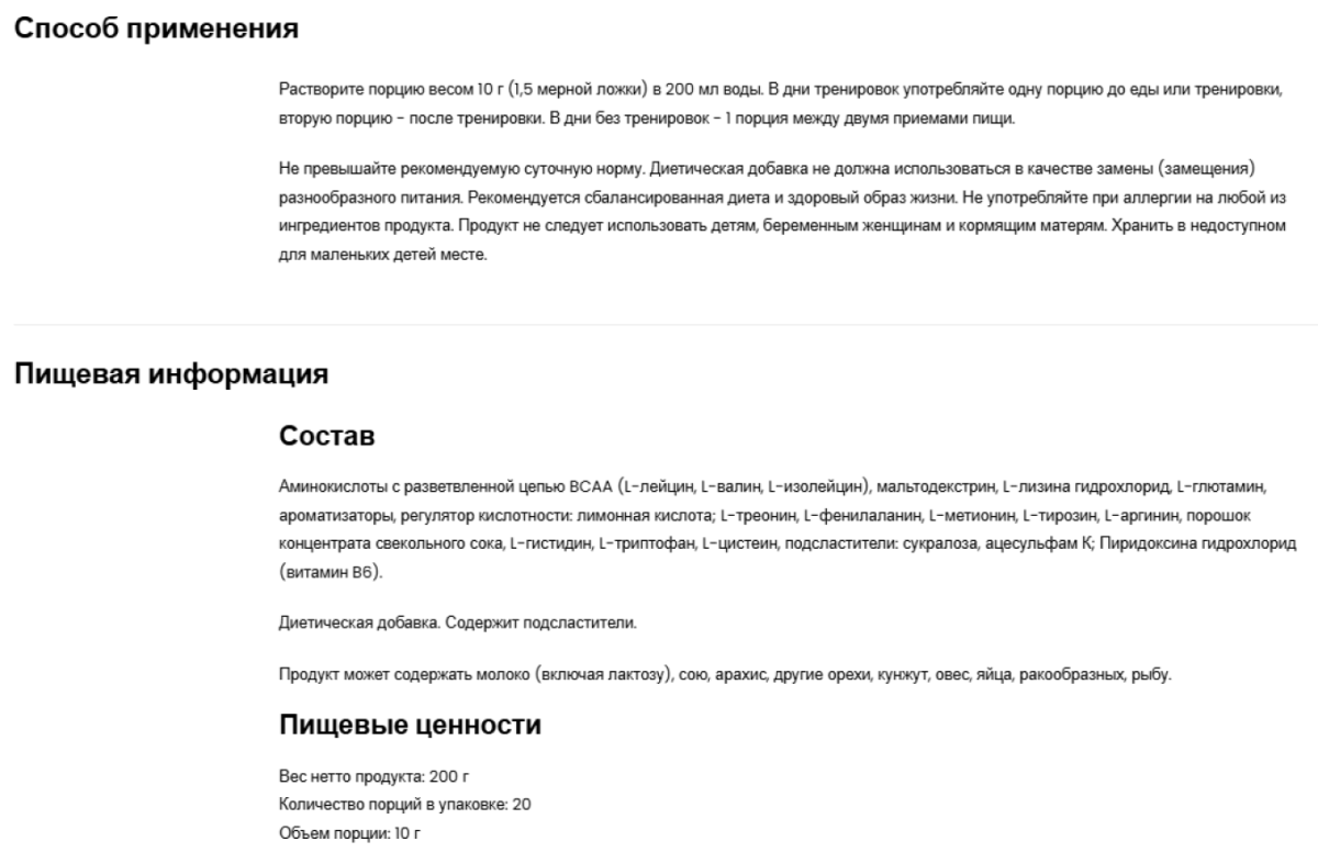 Источник незаменимых аминокислот - одна порция пищевой добавки обеспечивает организм 3 000 мг L-лейцина, 1 500 мг L-изолейцина, 1 500 мг L-валина и 1 350 мг L-лизина HCl, 700 мг L-треонина, 700 мг L-фенилаланина, а также 450 мг L-метионина и 400 мг L-аргинина. Кроме того, продукт содержит 300 мг L-гистидина и 100 мг L-триптофана..