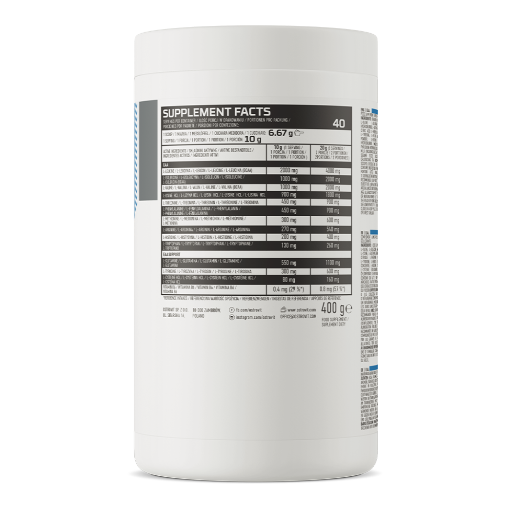 OstroVit EAA высококачественная биологически активная добавка, которая содержит 10 незаменимых аминокислот, в том числе L-лейцин, L-валин и L-метионин. Это препарат с простым составом и натуральным вкусом, доступный в удобной порошковой форме. Продукт предназначен спортсменам и людям, желающим дополнить свой ежедневный рацион ценными соединениями.