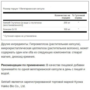 Получите Setria L-Glutathione, мастер защиты, в Swanson Ultra L-Glutathione с CoQ10! В сочетании глутатион и CoQ10 обладают полезной активностью. Оба являются внутриклеточными молекулами, необходимыми для здоровья и выживания клеток. Оба поддерживают клеточные энергетические функции. И то, и другое снижается с возрастом. Восполните то, что отнимает время, с помощью 200 мг фармацевтического качества Setria L-глутатиона и 100 мг коэнзима Q-10 на вегетарианскую капсулу.