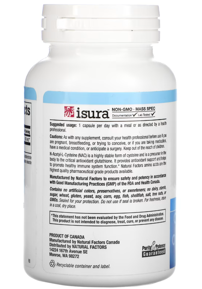 N-ацетил-L-цистеин (NAC) представляет собой высокостабильную форму цистеина и является в организме прекурсором важнейшего антиоксиданта глутатиона. Он обеспечивает антиоксидантную защиту и способствует здоровому функционированию иммунной системы. Аминокислоты Natural Factors — это продукты высшего качества фармацевтической степени чистоты.