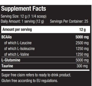 BCAA + Glutamine Xpress от Scitec Nutrition - добавка, которая содержит аминокислоты с разветвленной цепью (ВСАА) - лейцин, изолейцин и валин, и помимо обогащена двумя аминокислотами - L-глютамином и L-таурином. Систематический прием этих аминокислот необходим для надлежащей регенерации мышечных белков после физических нагрузок. Применение BCAA + Glutamine перед тренировкой влияет на рост силы и выносливость во время тренировки. Продукт предназначен для физически активных людей в качестве средства развития силы и мышечной массы. Характеристики действующих веществ: L-валин, L-лейцин и L-изолейцин - аминокислоты с разветвленными цепями - способствуют регенерации мышечных белков, особенно при состояниях, увеличивающих катаболические процессы и др.