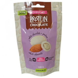 Драже от Chikalab – это сочетание пользы, прекрасного вкуса и удобства. Миндаль покрыт нежным белым шоколадом, изготовленным на основе концентрата сывороточного белка и без добавления сахара. Калорийность одной порции составляет 211 ккал.