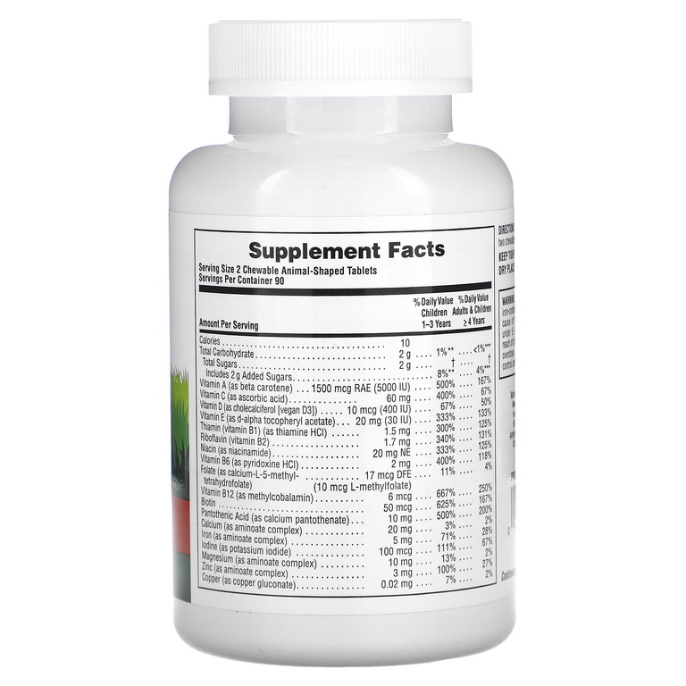 Натуральные подсластители (тростниковый сахар без ГМО, фруктоза), микрокристаллическая целлюлоза, лимонная кислота, целлюлоза (растительного происхождения), стеарат магния, натуральных ароматизаторов, карбонат кальция, гуаровая камедь, фумарат железа, фумарат магния, оксид магния, сок свеклы, спирулина (богатый природный источник питательных веществ), оксид цинка, плоды шиповника (Rosa canina), цитрат калия, цельный коричневый рис, плоды папайи, йодид калия, плоды мальпигии (Malpighia glabra), морковь, битартрат холина, аминоат калия, брокколи, шпинат и плоды манго. Минеральные аминоаты — хелаты из цельного коричневого риса.