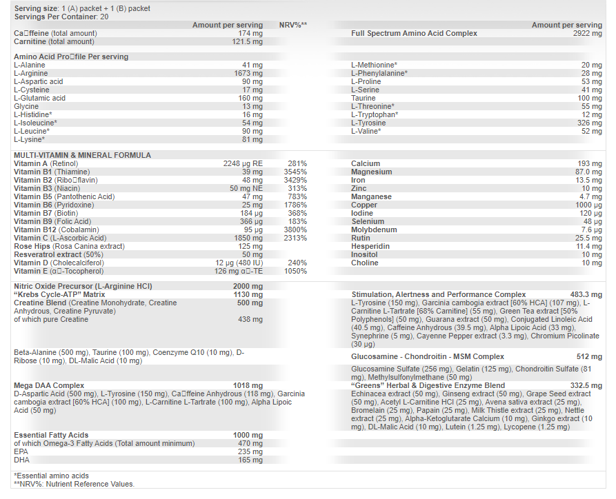 Витаминно-минеральные комплексы необходимы спортсменам для поддержания высокого уровня спортивных результатов и хорошего самочувствия. Проблема заключается в том, что, в большинстве случаев, рацион спортсменов содержит недостаточное количество этих важнейших микроэлементов. Помимо этого MONSTER PAK содержит смесь "зеленых" питательных веществ с необходимыми ферментами. Так же была включена матрица ATP®, которая ответственна за защиту мышечных тканей и дополнительный синтез белка в ответ на тяжелые тренировки. Формула MONSTER PAK была бы не полной без запатентованной формулы ПЕНТАКАРН, которая состоит из 5 компонентной л-карнитиновой матрицы, комплекса для защиты суставов и трибулуса.