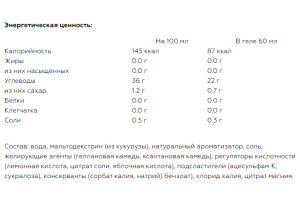 Энергетические гели c электролитами предназначены для обеспечения дополнительной энергии в течение интенсивных физических нагрузок, а также для восполнения потери минеральных солей при обильном потоотделении.