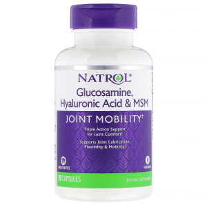Hyaluronic Acid + MSM & Glucosamine от компании Natrol сочетает в себе рабочие компоненты для более быстрого восстановления суставов. Данная добавка работает за счет Глюкозамина и МSM в сочетании с Гиалуроновой кислотой. Глюкозамин - известен своим свойством стимулировать обновление хрящей и эластичность суставов. Необходим для спортсменов и малоподвижных людей страдающих от проблем с суставами. MSM - легкоусваиваемое биологически активное соединение, обладающее широким спектром целебных свойств. МСМ значительно усиливает действие входящих в препарат компонентов, выводит из организма токсины, способствует восстановлению соединительной ткани, хрящей и костей, обладает мощными противовоспалительными и обезболивающими эффектами, в т.ч. в случае ревматоидных артритов. МСМ стимулирует заживление ран, ускоряет курс посттравматического лечения, облегчает восстановление костно-мышечной структуры при больших физических нагрузках на опорно-двигательный аппарат.