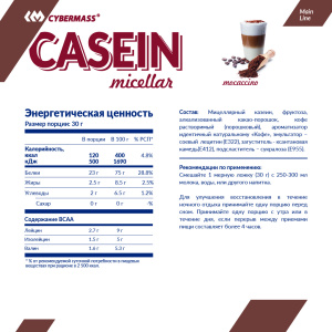 MICELLAR CASEIN – сложносоставной белок, являющийся результатом ферментного створаживания молока. Casein от Cybermass позволяет Вам значительно улучшить восстановление Ваших мышц после физических нагрузок! Мицеллярный казеин, благодаря своей структуре, усваивается значительно дольше, чем Whey от Cybermass, что позволяет ему насыщать организм аминокислотами до 8 часов! Casein от Cybermass идеален для приема перед сном., когда организм больше всего нуждается в питательных веществах. При этом мы позаботились о минимизации простых углеводов и сахаров в нашем продукте, и использовали только натуральные и безопасные ароматизаторы и подсластители, поэтому вы сможете насладиться великолепным вкусом!