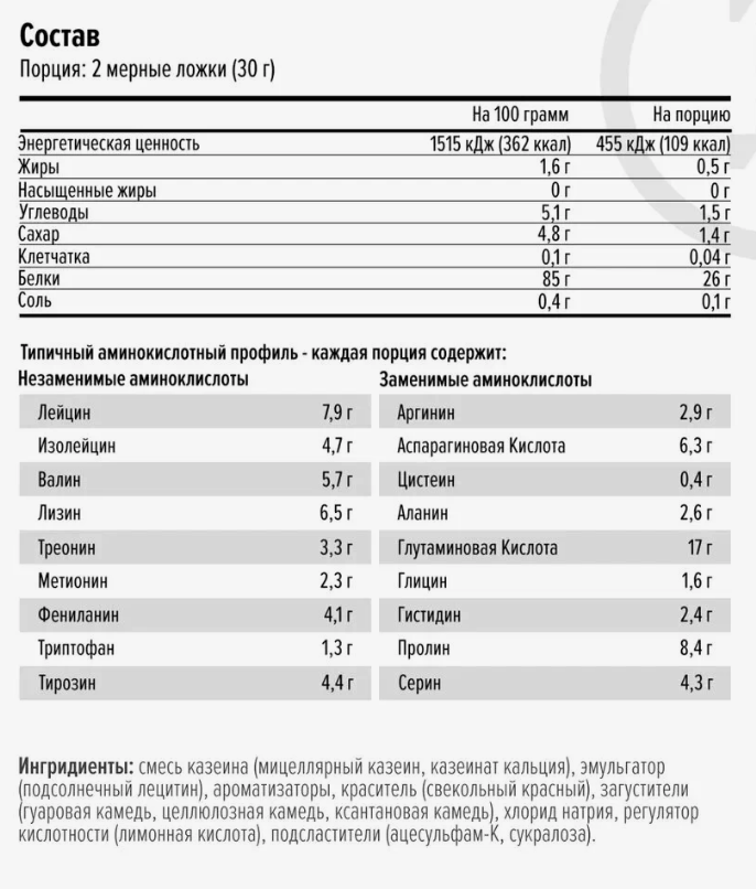 Длительное питание мышц: обеспечивает медленное высвобождение аминокислот в течение 6–8 часов, предотвращая катаболизм