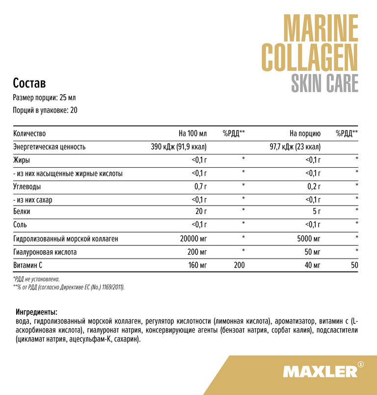 Maxler Marine Collagen Skin Care – это препарат, в котором все три компонента дополняют друг друга. Витамин С способствует выработке естественного коллагена в организме. Но после 20 лет его выработка начинает сокращаться, поэтому продуктивнее принимать добавку. В сочетании с гиалуроновой кислотой морской коллаген позволяет улучшить состояние кожи и сократить морщины, а также улучшить состояние связок, суставов, сосудов и мышц. Может применяться для восстановления тканей и суставов после травм.