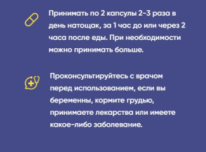 Продукт не является лекарственным средством и не предназначен для лиц моложе 18 лет, беременных и кормящих женщин. Перед приемом проконсультируйтесь с врачом. Не превышайте указанную дозировку. Меры предосторожности: хранить в недоступном для детей месте. Продукт не является заменителем пищи. Не следует превышать рекомендуемую дозировку. Производитель не несёт ответственности за любой вред, причинённый в результате ненадлежащего использования или хранения продукта.