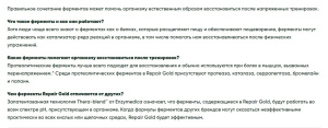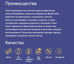 Repair Gold™ содержит серрапептазу с бромелаином, папаином и другими ферментами, которые, как известно, поддерживают уставшие мышцы и суставы. Ферменты работают синергетически с собственными механизмами обновления организма и могут поддерживать естественную реакцию организма на перенапряжение и напряженную деятельность. Смесь ферментов способствует комфорту суставов и здоровому кровообращению, что способствует ускоренному восстановлению мышц и тканей.