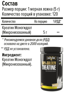 Maxler 100% Golden Creatine (Креатин) позволяет нарастить мышечную массу, увеличить выносливость и количество подходов на тренировке, а также энергичность без истощения ресурсов. Он работает на внутриклеточном уровне, а содержащегося в пище креатина недостаточно для спортсменов. Препарат также позволяет быстрее восстанавливаться после нагрузок.