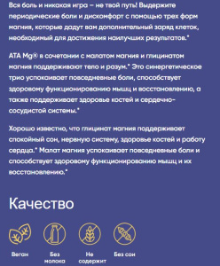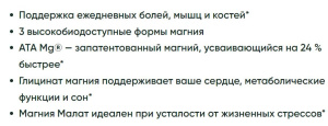 Аминокислота Таурин играет важную биологическую роль, например, в поддержании здоровой функции мозга, необходимой для нормальной функции скелетных мышц, а также действует на нейромодуляцию и релаксацию.* Таурин также является мощным антиоксидантом, уменьшающим количество свободных радикалов, вырабатываемых в мозге. ATA Mg представляет собой комбинацию магния и таурина в ацетилированной форме. Доказано, что она усваивается на 24% быстрее, чем другие популярные формы магния.