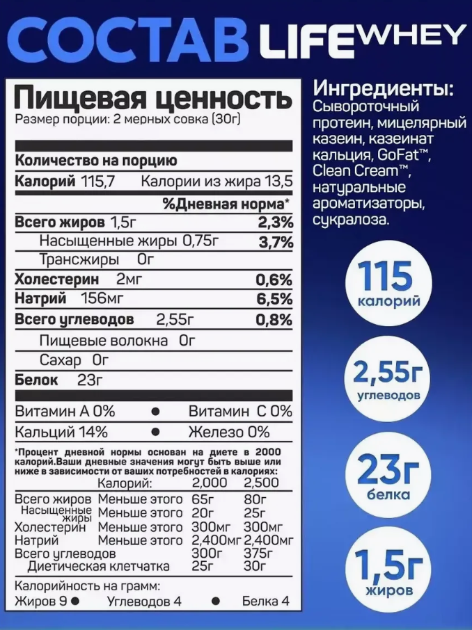 Это сывороточный протеин с добавлением казеиновой матрицы, что делает продукт более густым и похожим по консистенции на молочный коктейль. В одной порции содержится 23 грамма белка и всего 115 калорий, поэтому продукт подходит как для похудения, так и для наращивания мышечной массы. В состав входят натуральные вкусо-ароматические добавки и подсластитель сукралоза, отличающийся превосходным качеством и термостабильностью.
