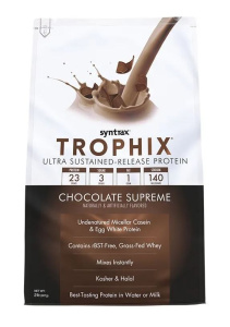 Trophix от компании Syntrax – это многокомпонентый протеин, состоящий из: концентрата молочного протеина, мицеллярного казеина, концентрата сывороточного протеина, яичного альбумина и глютаминовых пептидов. Trophix подходит для приема в любое время дня, так как содержит и быстроусваиваемые и медленноусваиваемые протеин.Главное его отличие от не менее популярного Syntrax Matrix – это то, что основным его источником белка является казеин – медленно усваивающийся протеин, который надолго создает чувство сытости, а также защищает и питает мышцы длительный период времени.Помимо вкусных протеиновых коктейлей с Trophix от Syntrax можно приготовить диетическую выпечку.