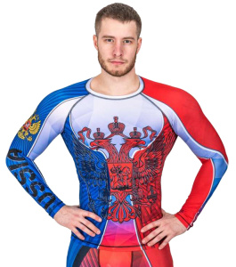 Рашгард Patriot с длинными рукавами. При создании модели использовалась высокотехнологичная компрессионная ткань из 87% полиэстера и 13% спандекса. Материал плотно прилегает к мышцам со всех сторон и сохраняет их в тонусе на протяжении тренировки. Ткань обладает способностью к влагоотведению и терморегуляции, чем максимально повышает комфорт при занятиях спортом. Части изделия сшиты нитками, аналогичными применяемым при пошиве сидений для автомобилей Porsche. Швы приятны к телу, не давят и не натирают кожу.