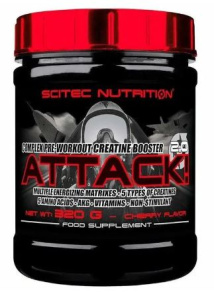 Attack 2.0 от Scitec Nutrition включает в себя ультрасовременные формы креатина: трикреатин малат, дикреатин малат, микронизированный креатина моногидрат, креатин этил эстер, креатина оротрат а так же аргинигин АКГ и цитрулин малат. Формула Insulin Maximizers стимулирует выброс инсулина способствуя быстрой доставке питательных веществ в клетку, а L-аргинин аргинин заметно усиливая кровоток обеспечивает быстрое наполнение мускулатуры кровью, в итоге Вы получаете видимую прибавку в объёмах, качестве и плотности мускулатуры. ATTACK! препятствует окислительным процессам в организме, нейтрализует молочную кислоту, обеспечивает вас дополнительной энергией, участвуя в реакциях восстановления АТФ. Attack не содержит кофеина и может быть рекомендован для вечерних и ночных тренировок , так как почти не нарушает сон.