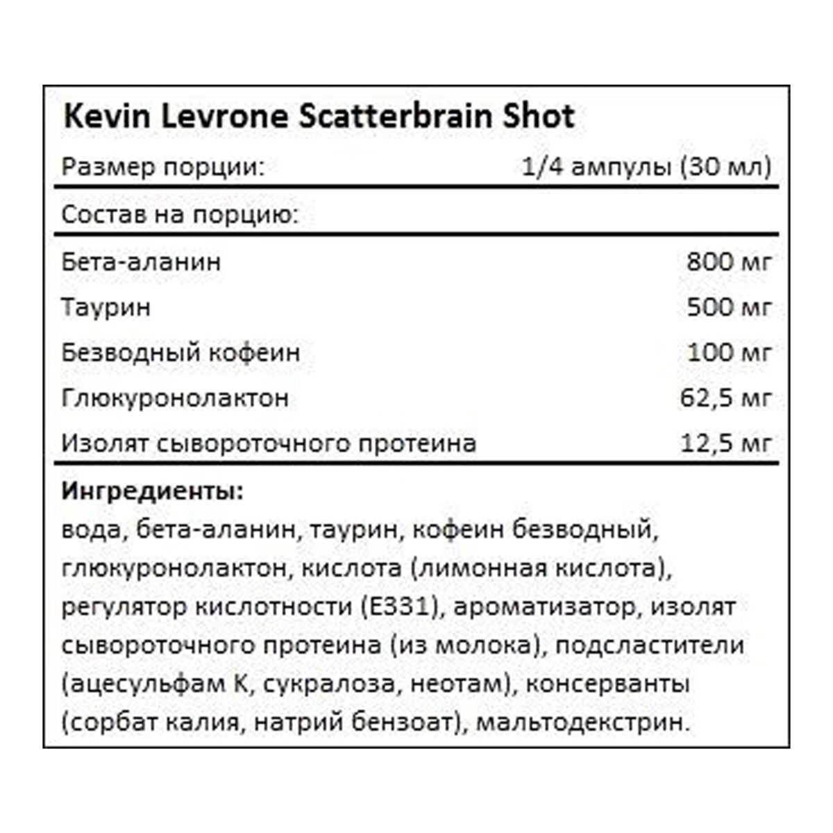 Kevin Levrone SCATTERBRAIN SHOT — это многокомпонентная предтренировочная формула, предназначенная для людей, которые подвержены высокой утомляемости во время интенсивных тренировок. Состав оптимально подобранных комбинаций 5 активных компонентов обеспечивает многомерную поддержку при возрастающей психофизической нагрузке и обеспечивает создание благоприятных условий для работы над силуэтом вашей мечты.