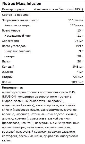 Калорийность порции Mass Infusion, достигающая внушительных 1120 калорий, позволяет обеспечивать организм таким количеством питательных веществ, который способен поддержать анаболические процессы даже у хардгейнеров. На 1 порцию гейнера приходится 50 г белка и 199 г углеводов. Очевидно, что такой состав способствует более эффективному набору массы. Ведь и мышцы, и организм в целом получают много ресурсов для поддержания всех важных процессов.