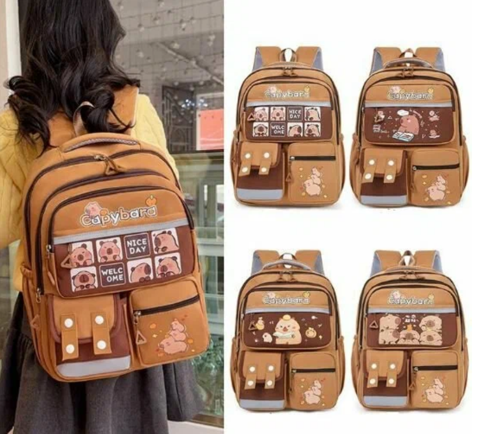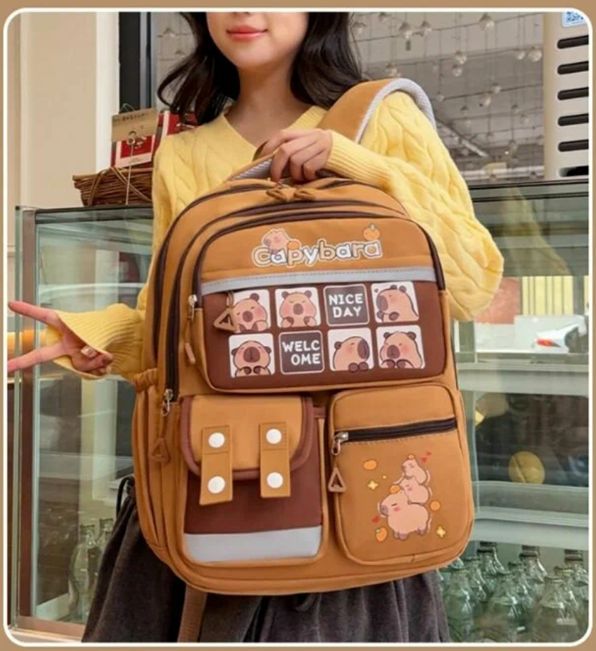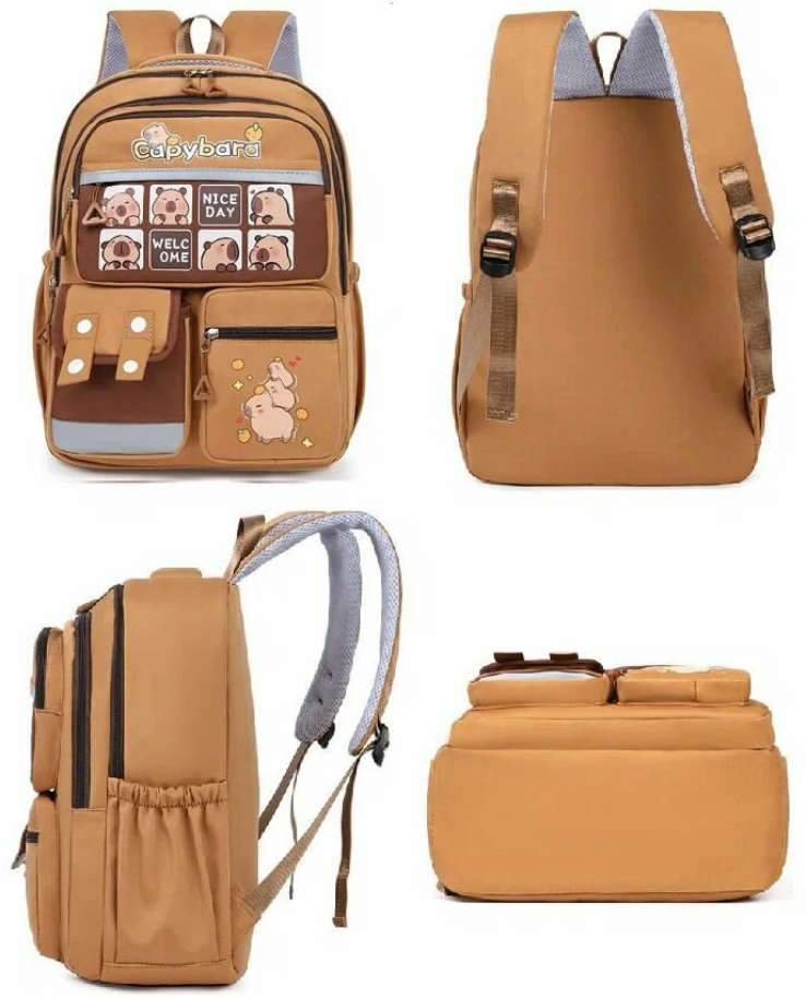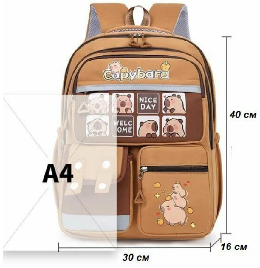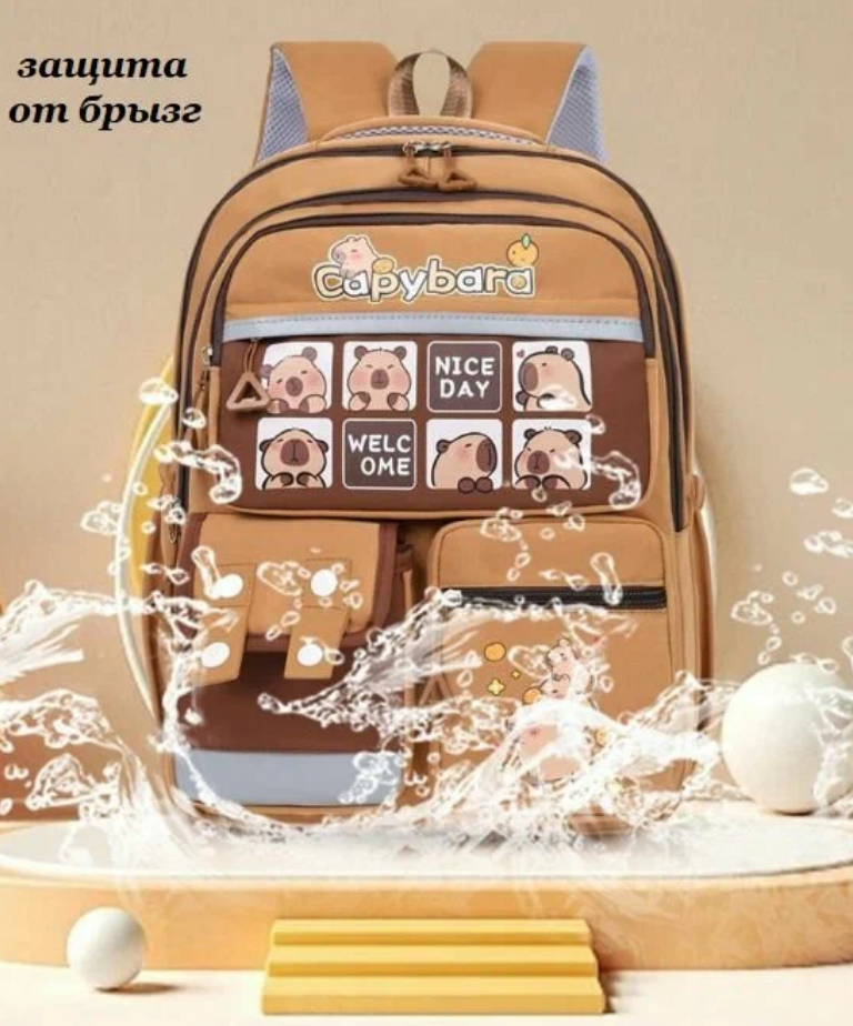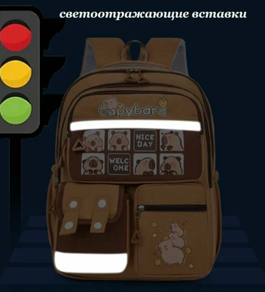 Школьный городской рюкзак капибара с ярким и модным дизайном станет стильным аксессуаром для девочки или мальчика. Основной цвет школьного ранца – коричневый, что делает его универсальным и практичным. Лицевая часть украшена изображением самой милой водосвинки - капибары, добавляющими милый акцент в духе y2k. Спортивный рюкзак для подростка выполнен из качественного материала с гладкой матовой текстурой, устойчивого к загрязнениям, механическим повреждениям и брызгам воды. Передняя часть дополнена множеством карманов разного размера: два на молнии для мелочей, один с клапаном на липучке, что позволяет удобно организовать пространство для школьных принадлежностей или личных вещей. Боковые части оснащены сетчатыми кармашками, подходящими для бутылки воды или зонта. Анатомическая спинка с мягкими вставками обеспечивает правильное распределение нагрузки. Широкие регулируемые лямки позволяют настроить повседневный рюкзак под рост ребенка. Светоотражающие элементы гарантируют безопасность в темное время суток.