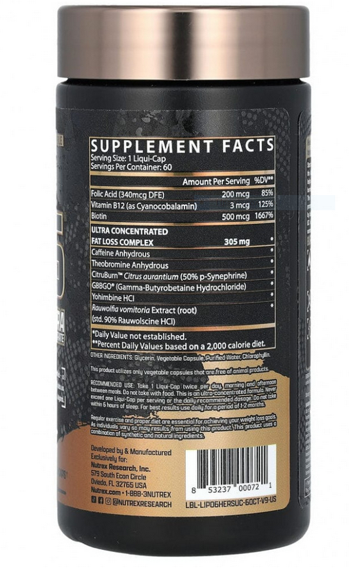 Важно. Ультраконцентрат Lipo-6 Black® абсолютно не предназначен для использования лицами младше 18 лет или чувствительными к кофеину. Не принимать в период беременности и кормления грудью. Каждая порция этого продукта содержит 200 мг кофеина, что примерно равно 1–2 чашкам крепкого кофе. Во время приема этого продукта контролируйте другие источники кофеина, такие как лекарства, продукты питания и напитки. Не употребляйте йохимбин, синефрин или компоненты для активизации работы щитовидной железы из других источников, включая, помимо прочего, другие пищевые добавки или лекарства, содержащие фенилэфрин или любые стимуляторы. Не следует превышать рекомендуемую дозировку. Не следует употреблять алкоголь при приеме этой добавки. Не используйте этот продукт дольше 60 дней. После курса приема сделайте 15-дневный перерыв. Перед использованием этого продукта следует проконсультироваться с врачом, если вы принимаете препараты, включая, помимо прочего, ингибиторы МАО, антидепрессанты, аспирин, нестероидные противовоспалительные препараты или продукты, содержащие фенилэфрин или другие стимуляторы. Перед использованием этого продукта следует проконсультироваться с врачом, если у вас есть какие-либо заболевания, включая, помимо прочего, болезни сердца, печени, почек или щитовидной железы, психические расстройства, затрудненное мочеиспускание, диабет, высокое артериальное давление, сердечную аритмию, повторяющиеся головные боли, увеличенную простату или глаукому. Прекратите использование за две недели до хирургических операций. Немедленно прекратите использование, если вы испытываете учащенное сердцебиение, головокружение, сильные головные боли или одышку. Этот продукт содержит ингредиенты, которые могут быть запрещены некоторыми спортивными организациями. Хранить в недоступном для детей месте.