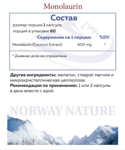 Norway Nature Monolaurin 600 mg 60 капсул - это органическое вещество, которое представляет собой моноэфир лауриновой кислоты. У этого вещества есть только два природных источника. Первый из них - грудное молоко, где монолаурин является одним из первых природных усилителей иммунной системы. Вторым источником монолаурина является кокосовое масло, где содержится большое количество этого элемента. Главная функция монолаурина - борьба с различными инфекциями, поэтому его часто применяют в целях профилактики различных заболеваний и укрепления организма, а также для поддержки и стабилизации метаболизма и работы ЖКТ. Norway Nature Monolaurin - производится из натурального кокоса и обеспечивает 600 мг монолаурина на каждую порцию.