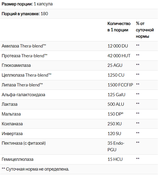 Принимать по 1 капсуле во время каждого приема пищи. При необходимости можно увеличить дозу. Для повышения активности ферментов можно принимать Digest Gold™ от Enzymedica.