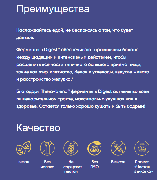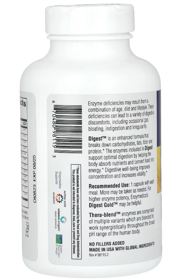 Средство Digest™ содержит усовершенствованную формулу, которая расщепляет углеводы, жиры, клетчатку и белок. Ферменты, входящие в состав Digest, поддерживают здоровое пищеварение, помогая организму усваивать питательные вещества и получать энергию из пищи. Здоровое пищеварение способствует улучшению концентрации и повышению жизненного тонуса.