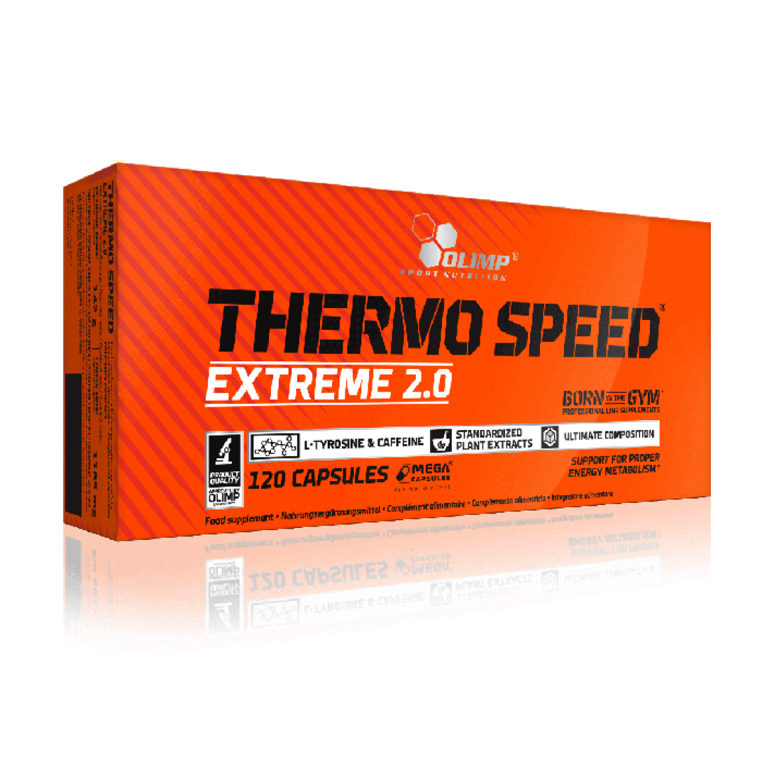 Olimp Thermo Speed® Extreme 2.0 Мега Капс . Пищевая добавка в капсулах. Препарат сочетает в себе L-тирозин (аминокислоту), кофеин и ниацин (витамин), а также экстракты зеленого чая, гуараны, кайенского перца и черного перца. *Ниацин способствует нормальному энергетическому обмену.